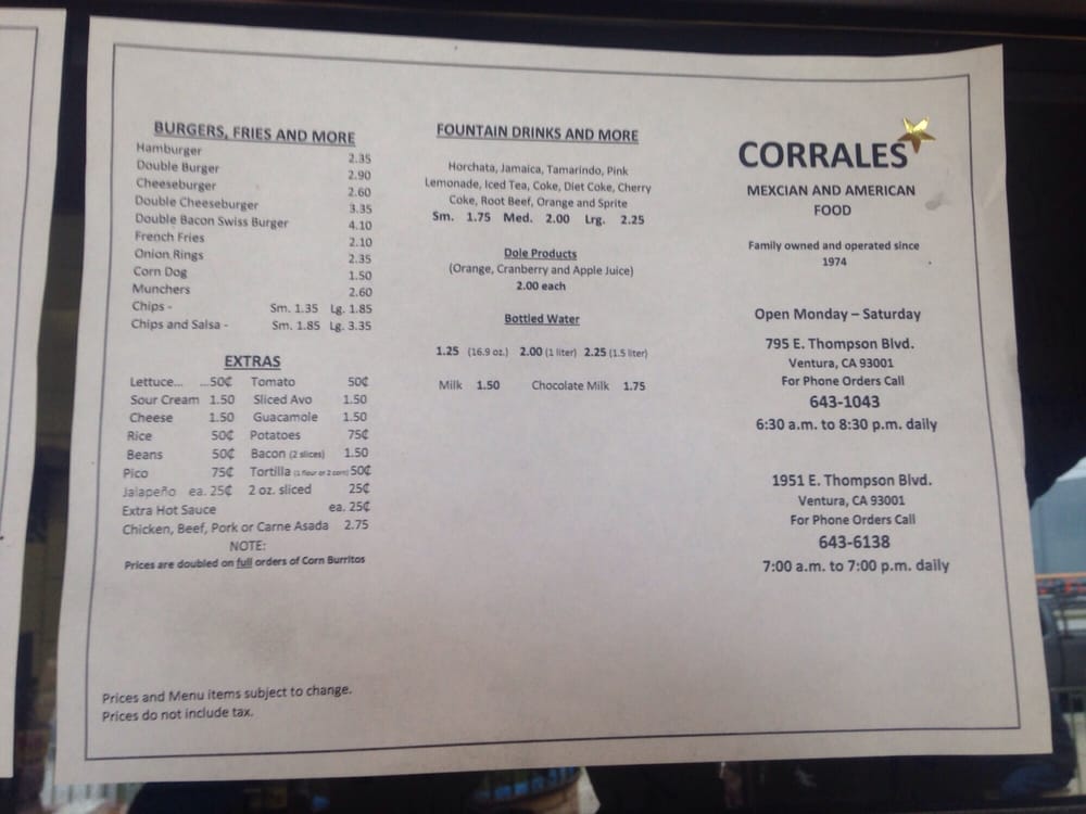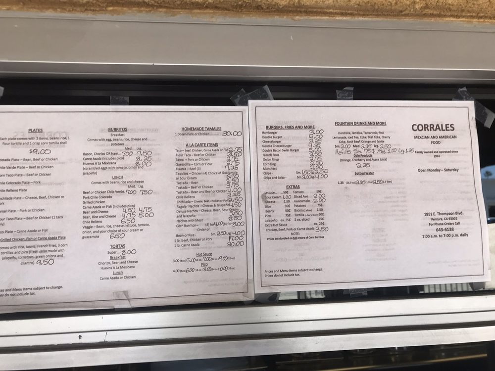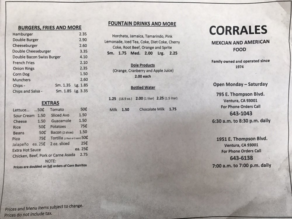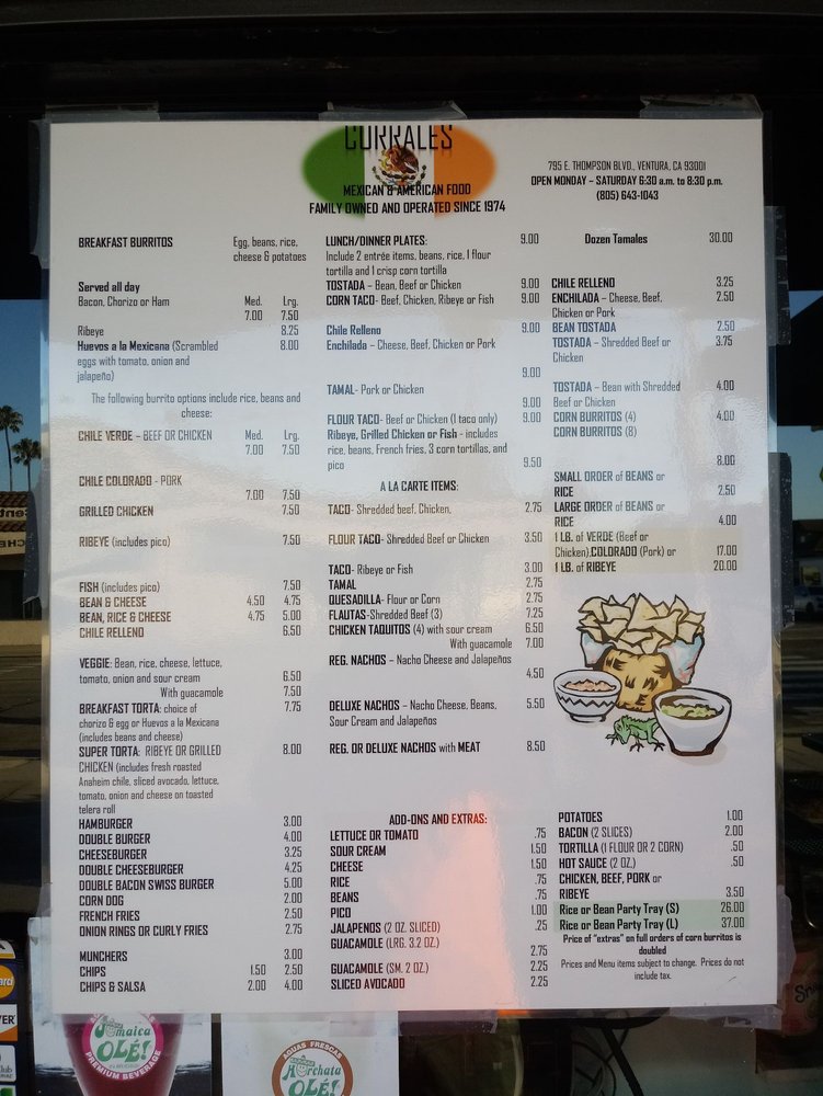 Corrales Mexican Food in Ventura, CA offers a delightful menu filled with flavorful Mexican dishes. The restaurant provides a cozy and casual dining experience, with options for delivery, outdoor seating, and catering services. Customers rave about the generous portions and delicious salsa served at Corrales. From their classic bean and cheese burrito to the chicken taquitos, every dish is made with love and care, bringing back nostalgic childhood memories. The friendly staff adds to the welcoming atmosphere, making it a favorite spot for locals and visitors alike. The menu offers a variety of options, including vegan and vegetarian choices, ensuring there is something for everyone to enjoy. Don't miss out on their famous Orange Bang drink to complete your meal. Corrales Mexican Food is a must-visit for authentic and satisfying Mexican cuisine.